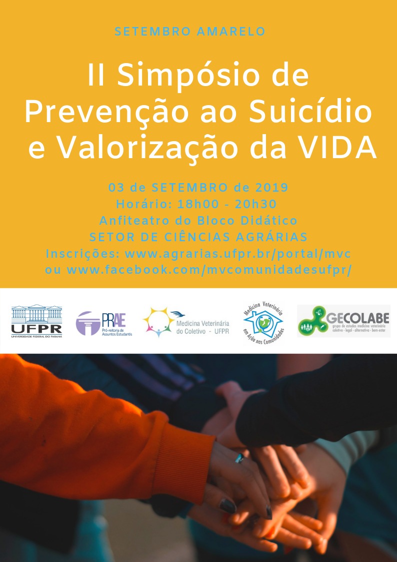 A depressão e o suicídio são problemas globais, atingindo indivíduos de diferentes faixas etárias, sendo por isso uma grande questão social e um agravante a saúde pública. Pesquisas mostram que os índices de mortes por suicídio de jovens de 15 a 29 anos cresceram significativamente nos últimos anos. Tendo em vista a importância desse tema, nesse setembro amarelo, convidamos você a participar do evento “II Simpósio de Prevenção do Suicídio e Valorização da vida”, que acontecerá dia 03 de setembro no Anfiteatro do Bloco didático do Setor de Ciências Agrárias.